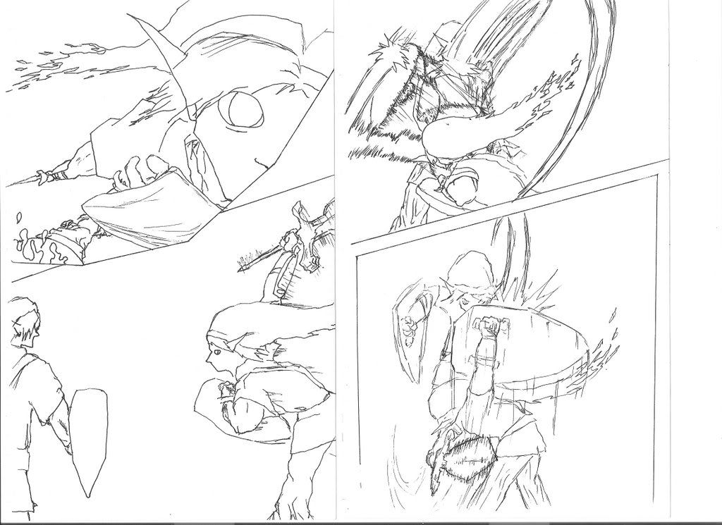 I've been working on a manga style version of the Link vs Dark Link fight, a little bit at a time, over the past couple months. Here is what I have so far, no screen tones, detailed line depth, or editing yet. Two pages per image, read left to right. http://i217.photobucket.com/albums/cc53/IC...ios/Pg1and2.jpg http://i217.photobucket.com/albums/cc53/IC...ios/Pg3and4.jpg http://i217.photobucket.com/albums/cc53/IC...ios/Pg5and6.jpg http://i217.photobucket.com/albums/cc53/ICLHStudios/Pg7.jpg Any crits or comments welcome, (I know about the awkward looking, and missing legs in the second page, and the fact that D. Link is to high up in the first, I plan to edit those later.) |