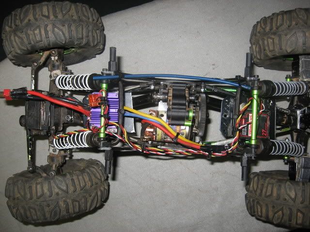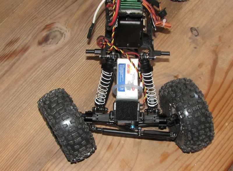 On my ax-10 I had the ESC on the rear upper links, The receiver on the Trans, and a 3 cell lipo on the front upper links behind the servo. Posted Image Posted Image |