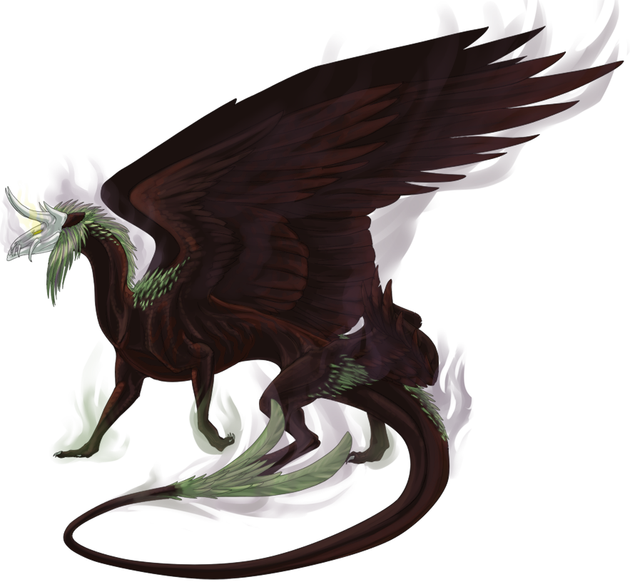 Character Number- 5 Name- Geist Age- 98 [updated Jul2015] Gender- Female, though, it’s very hard to tell Element- Ruin Appearance- Geist is a shadowy figure, preferring to wander at night to shade her thin, long form. Standing at about 21 feet tall at the shoulder, she’s more than capable of squishing a few people under her long toes as she goes, though, she’s lost a significant amount of weight to her vapors over the years. However, her length, like most ruins of her age, is more difficult to discern. As a hatchling, she was about three and a half times as long as she was tall, but, with her trails of vapor blending where she ends and the air begins, there’s no way to know the measurements now. Even her vapors have shifted. Over the years her initially dusky lavender gasses had become intertwined and almost overcome with long, streaks of acidic green, showing her slow growth in power. As she is now, her dark red, almost black base color is slowly being covered by the ever encroaching vapors. Though both her spine stripe and her rib markings are rather easily seen when the wind is cooperating, her shoulders, where her mane was once the thickest, is now clouded with the semi-opaque gas and her back legs are almost completely drowned in it. The vapors only let up around her calves slightly in back, while, forward of that, her front claws are only partially obscured around the wrist. The gasses do spill down her back a bit, slipping in and out of her mane and halfway down the thick of her tail to make a greedy puff at the tip, where the needles there used to grew in fans. Two of her wing sets, as well, have mostly been taken. Only her foremost set, and her largest, is more or less untouched, but still trails the vapor. The pools of gas from all over her body tend to gather where they are created, trailing off lightly or settle in haunting fogs on the ground. There, where it coils low, sometimes lonely, half-formed shapes appear as people or animals. She’s steadily learning how to condense it into more and more solid forms, as of now, using the silhouettes to frighten or lure people. The most frequent of her crafts is a human figure that coalesces to supply gestures or body language that she, as a dragon, is less able to imply without moving facial features. Sometimes, when alone, she pulls together her vapors in the tiny, childlike shape of her missing rider. The ghost walks close with her in the cloud or sits upon her back to take the small, empty seat now unused. To her face, the Ruin’s unmoving mask, cemented in place decades ago, is a monstrous carving, part beast, part demon, with thick fang sets that cross above and below in front and one massive set that dips down at the very back of what would be her mouth. Her black, marble lips are curled up in a half snear-half snarl as her eye ridges heavily lower across her three sets of eyes, all seemingly moving within one socket. Her two sets of horns seem stolen from bulls. Somewhere between the horns and above her eyes, her pulsing, sickly yellow crystal sits, neatly broken in perfect halves. Though, neither the devilish mask, nor the sharp horns are able to hold back her tapered, swiveling needle ears, keen to the sounds of the world. Besides her particular appearance, however, her voice is an important part of first impressions. The base, her first voice, is low, slightly deep, but neither obviously masculine nor feminine. She has many other voices that speak in whispers underneath, but, depending upon the situation, one may come out louder above the rest. The most discernable ones are heard as a more masculine voice, a foxy feminine tone, a sextet of a swoon-some boyband that all speak in harmony, a crackling elderly woman’s rhasp, or that of a child, presumably her lost rider. New Ref with updated Horns Geist by Nherva! Personality- Seemingly serious most of the time, Geist is a spectre of a dragon. She often haunts different places, sliding on her vapor wings with a malevolent air. She’s very intelligent and often up for plotting something or being spiteful. She’s not usually taken to revenge, unless she’s seriously wronged, but she’s a calculating creature and bears grudges deep. She deals a lot in sarcasm and cynicism, but in a mature, almost condescending way that covers up her impish delights in tormenting those she feels deserve it. Having grown into it, she’s also got a cruel streak a mile wide and 16 fathoms deep, a great love for cat and mouse, and no true loyalties to anyone anymore. She is apathetic and restless, unwilling to follow the orders of others unless she feels or deems them nessisary. So, unlike her inexperienced child self, anyone would be hard-pressed now peak Geist’s interested truly serving the tainted lords. She only cares mildly for the purging of Sekkian riders, though, she enjoys the thrill of the hunt now just as she did in her childhood. Geist doesn’t have the haughty pride that many of her element’s untainted base do, but is frequently willing to slyly speak of the foolishness of others in her multi tongued voice. As well, she has become significantly more somber since the disappearance of her partner, though, it can’t be seen on her stone mask features and she tends to cover up this part of her in several ways, one of which is temporarily claiming a town, jumping out at people and scaring the crap out of the inhabitants. She’s also famous for raiding supply stores of sugar or sweets, using her vapors to pull the taste and texture from the foods and leave them as dust before devouring a person or two in the same manner. When she’s not kicking some house over out of dispassion or stealing candy from babies, she may indulge in a little seen, shocking habit. Though so uncaring about the majority of the living, she does have a little piece of her heart left somewhere down deep in there, and she’s given it to a particular species of small, furry, long eared hoppy animal (