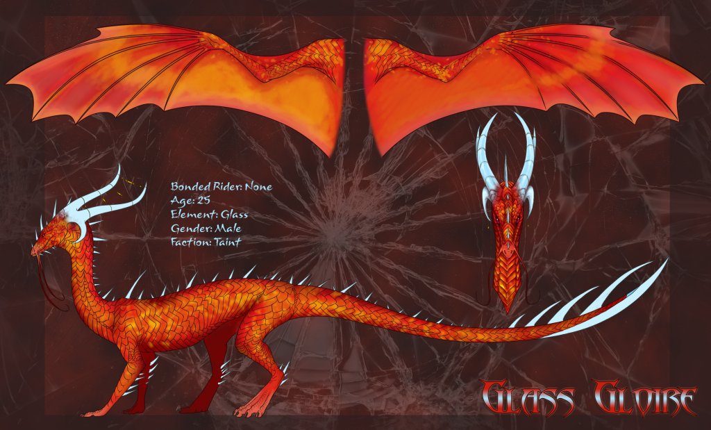 Gloire’s wings are long and broad, suited quite well for traversing higher altitudes and traveling long distances on a limited number of wingbeats. Boasting six wing fingers, it is easy for him to manipulate the direction of the currents that hold his form in the sky. His lengthy tail, too, can act as a rudder of sorts. At the end of his tail rests a deadly hook-like structure composed of natural, elongated dorsal spines and implemented glass of his own doing. He has applied layers of the semi-molten substance to it and morphed his own biological weapon. Two rows of spines, one dorsal and the other ventral, jut out from his tail as well along the latter half of this appendage. However, beneath the coating of semi-colorless glass, a horizontal scar can be seen. It is the result of conjoined tails of his twin from his time within the shell. If exposed, or subjected to the correct lighting, a faint blues and golds and Raku shimmer can be seen, a testament to his sister’s presence. However, Gloire chooses to keep it hidden. His elbows, hocks, and spine are also adorned with similar barbs than can be used to stab his opponents of the off chance he is pulled into a close combat. His talons, too, are outfitted with sheathes of serrated, ground glass to elongate his delicate claws. Gloire’s red crystal is nestled snugly between his collarbones, the smashed cracks of which appear to extend to that of the surrounding chest and neck.