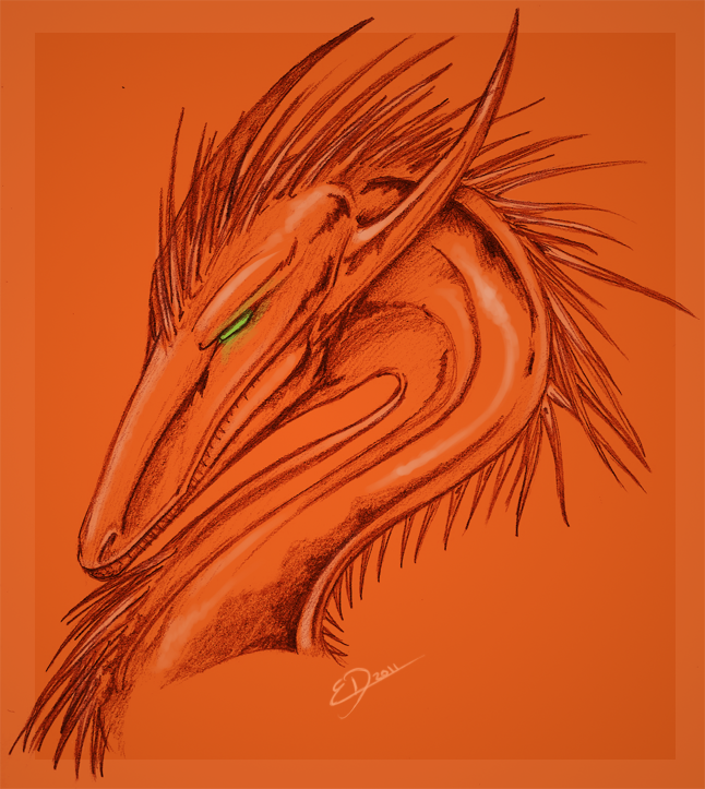 Poured over her like molten ore over a mold is a rich, sunset orange copper hue that is finished with a mirror shine polish. Ever inch of her is glistening alloy brought to life over weaker tissue and bone. Guillotine's eyes are the only living exception to her metal coating, ablaze with life and devious emotion within the stunning green irises. They are like a pair of socketed malachite gems fitted perfectly into her narrow skull. Last of all to her appearance, and most obliquely hidden, is her crystal. It rests between the two tail blade fans, nestled safely between them on the underside of her tail's length. The haunting gem is a cruelly edged, curving loop of infinity. A figure-eight with a faceted frontal face, but edges cold and sharp as the blade of a knife. It is thickest at the base where the glamorous ribbon begins, wrapping around itself to become narrow at the upper looped crossing only to inspissate once more to meet end with beginning. Both paunchier ends were pools of obsidian black which slowly eroded along its winding road into a splotched, murky green.