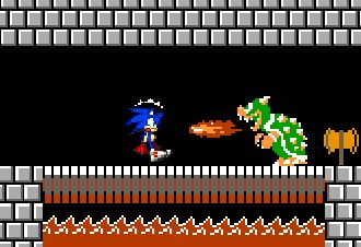 Well, since someone else posted I suppose I'll get back to Sonic for us. Let's see, where was I ? Oh yes, it looked real bad for Sonic. Sonic couldn't possibly make it to the pipe before he drowned and there was no evident way for him to get more air. Just then, with hardly any time left, Sonic instinctlively thought of a way and and used his homing attack to quickly bounce up off the nearby Bloopers and Cheep Cheeps to rocket his way above the surface of the water just in time. With some more quick thinking he used his figure-eight super peel out maneuver to hover in the air a short while in order to gain suffecient air to go back under. ;) GASP ! Man, that was close ! One of these days I have GOT to learn how to swim. Whew ! Here I go again. Sonic goes back underwater and slowly makes his to the pipe. After he enters it he comes out at yet another fort with a flagpole. Exhausted from his difficulties underwater, Sonic makes no effort to reach the top of the flagpole and settles for the bottom. He has now cleared 2-2 and is well rested when he makes his way into 2-3. World 2-3 proves of little difficulty to Sonic. He comes upon a long, long bridge with a few areas missing. Sonic finally has the opportunity to make use of his speed and races down the bridge at an amazing pace leaping over the gaps. Had he took his time he would have realized the Cheep Cheeps that were leaping up at the bridge to attack him but he didn't and they found it impossible to catch him. ;) Yeah ! This is more like it ! The only time he stops for only second is to hit an item block rewarding him with another Fire Flower and he regains his fire abilities. Sonic reaches the end of the bridge in no time and is expecting yet another little fort. He is greatly surprised when the "little fort" turns out to be a huge castle ! He enters quickly without giving it another thought and prepares to face the challenges of World 2-4. After entering the castle Sonic dodges all sorts of dangerous situations. He finds that the Fire Flower he picked up along the way is of little use in here as fire is launched at him from every angle. He jumps over pools of lava, ducks beneath fireballs being launched at him, and carefully makes his way to the end of the castle. He approaches cautiously as he sees a bridge over a lava pool leading to the exit. Standing at the exit breathing fire at him furiously is the great king of all the Koopa, Bowser ! Sonic can hear meek cries from help in the next room and intends to respond as he walks up to Bowser with a very serious and determined expression on his face. ;) So, you're the big cheese around here, huh ? Bowser, right ? Bowser : What ?! Who are you ?! Where's that puny, plump, pathetic plumber !?! ;) Mario ? Oh, he's off . . . sight-seeing you might say. On vacation in another land. I'm Sonic, Sonic The Hedgehog ! Bowser : Oh yeah, well I think I'll find out what roasted hedgehog tastes like ! ! Posted Image Bowser breathes a steady stream of flame at Sonic but the hedgehog leaps above it and delivers a swift kick to Bowser's chest. To his astonishment, Sonic's kick is useless against Bowser's hard shell and Sonic fall to the floor in front of the dastardly dragon. Bowser : Ha ! Is that the best you can do ?! Sonic narrowly avoids being burnt to a crisp as he spin dashes under Bowser and comes up behind him. He gets ready to try something else but is stunned when he sees the sharp spines all over Bowser's shell back. Bowser slams Sonic into the door behind him with his muscular tail. Sonic has been thrown off the bridge and is on a ledge and right next to him on a pedestal is a great axe. As Bowser slowly turns around, Sonic removes the axe and cuts the ropes holding the bridge together and Bowser falls into the lava pool beneath. Bowser : CURSE YOU ! AAAAAAAAAARRRGH ! ! ! Immediately afterward, the door opens and in the dungeon Sonic finds a small person with a mushroom hat who speaks to him. Mushroom Servant : I'm sorry . . . who the heck are you ?! ;) The name's Sonic The Hedgehog. Mushroom Servant : Oh, well that was unexpected. Oh well. I'm sorry, Sonic but our princess is in another castle. ;) What ?! Oh great. So ends World 2-4 and Sonic begins his next stage of the journey starting at World 3-1. |