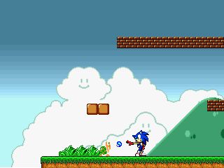 With a brilliant green flash of light Sonic arrives in the realm of the Mushroom Kingdom. He's shocked by the strange area he finds himself in. :sonic: Man, is this place cheesy-looking or what ?! He proceeds forward until he meets up with a Goomba's snapping jaws. :sonic: I don't what that thing is but it sure don't look friendly. I highly doubt it can handle a Sonic spin. Sonic homes in on the Goomba and knocks it out with his spin attack. As he bounces off the Goomba he bumps into an item block above and out pops a mushroom. :sonic: Huh ? What am I supposed to do with that ? Sonic picks up the mushroom and grows to twice his original size making him match the size of the area. :sonic: Whoa ! Freaky. He hits the next block and out pops a coin and he then hops over a pipe where he finds two more Goombas. :sonic: More of these lil' weirdos. He charges straight through them with a spin dash and continues on jumping over the next pipe. His speed nearly causes him to meet his end when he comes up on a bottomless pit up ahead. :sonic: That was too close. He jumps over the pit with ease and finds himself face to face with a Koopa Troopa and more nearby item blocks. He jumps onto the Koopa's shell with his spin attack causing it to flee inside its shell. He then hits the two item blocks and is rewarded with another coin and a Fire Flower. He picks the flower from the block and suddenly the colors of his gloves and shoes change and he feels himself imbued with a strange power. Just then, the Koopa Troopa peeks its head back out from its shell. :sonic: Back for more, huh ? Posted Image A ball of blue fire jumps from Sonic's hand and hits the Koopa sending it over into the nearby pit Sonic just crossed. :sonic: WOW ! How . . . how did I do that ? Way past cool ! Sonic goes on a rampage blasting blue fire and spinning his way through Goombas, Koopa Troopas, and Pirahna Plants until the next item block he hits rewards him with a star. A new energy fills Sonic's being as he absorbs power from the star. |